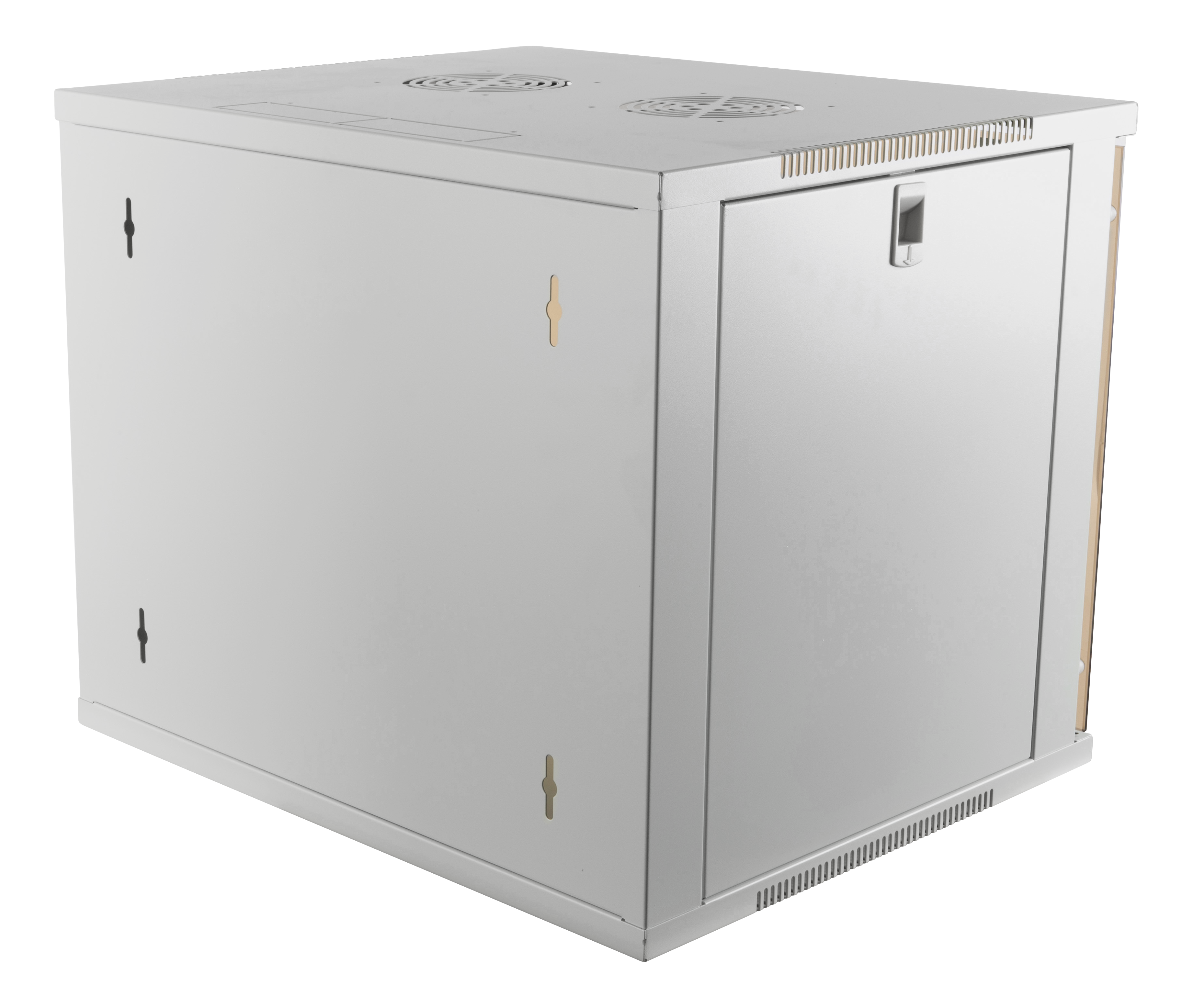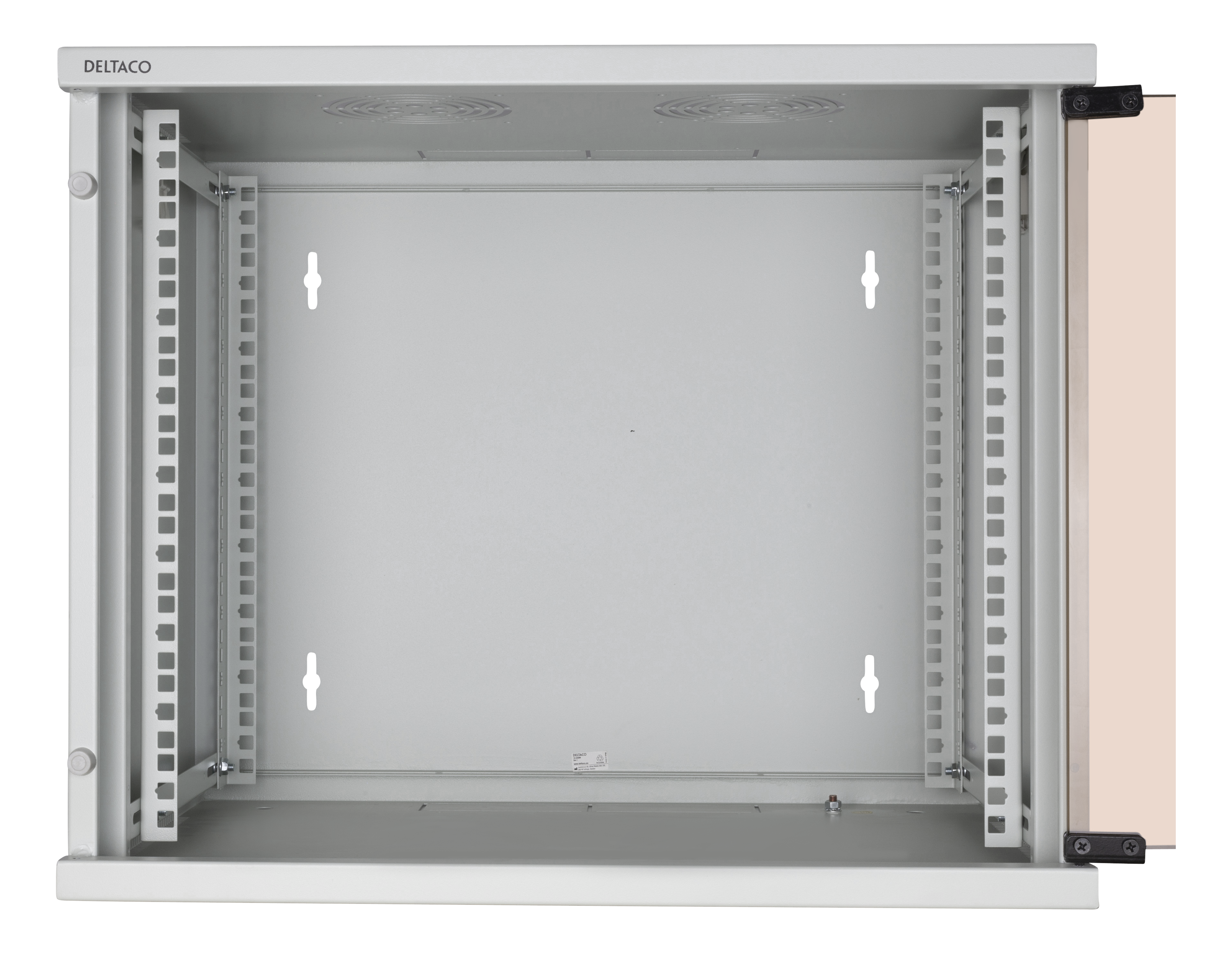 The cabinet can be mounted on the wall or standing by itself on a tabletop with the included feet. The 19" rails in front and back can be adjusted depthwise and if there is a need for cooling the top has place for two 120 mm fans. For shielded equipment there are a grounding terminal in the bottom to carrying away interfering signals.