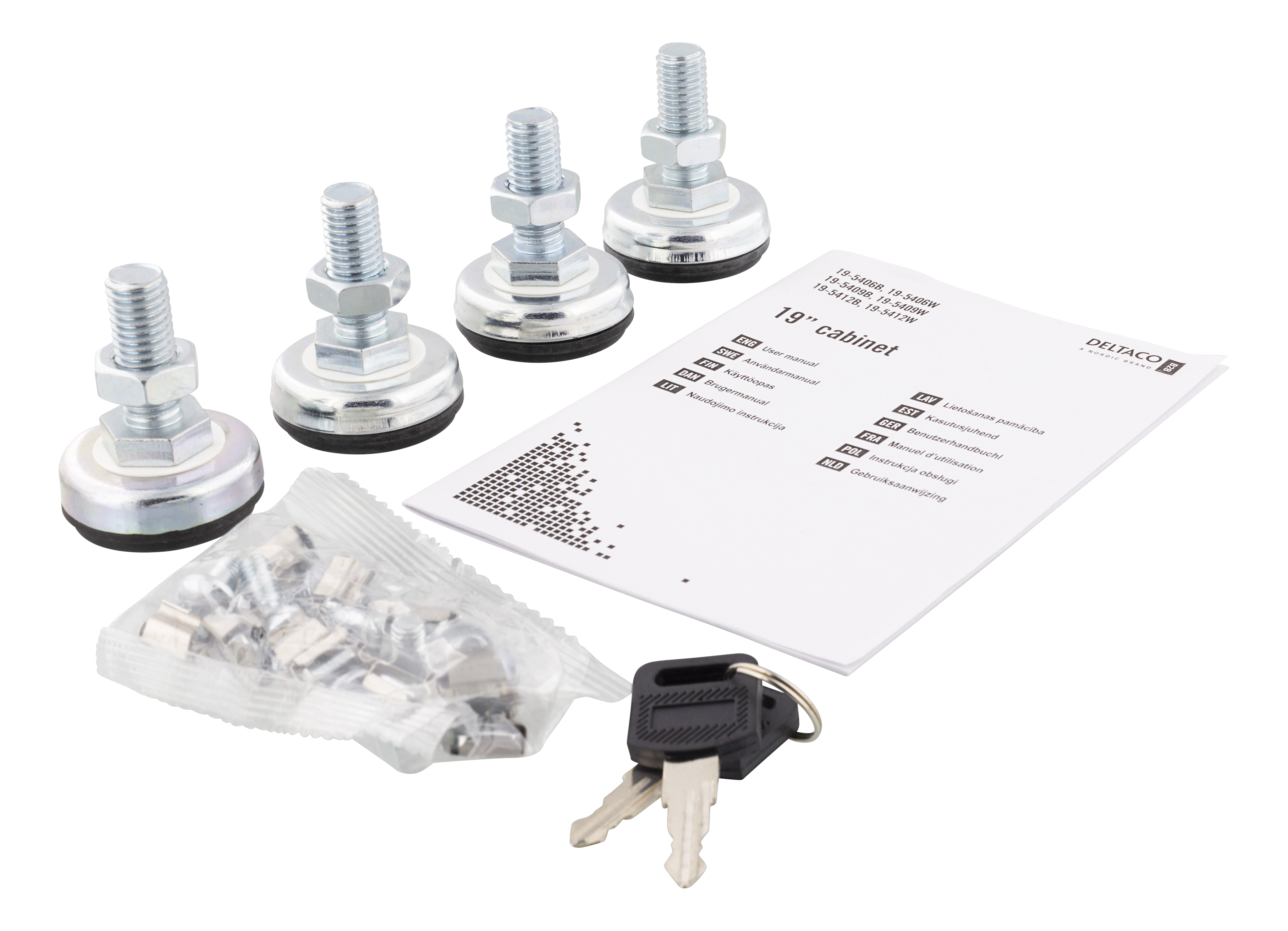 - Delivered together with 4 x feet, 10 x cage nuts, 2 x front door keys and a torx wrench.