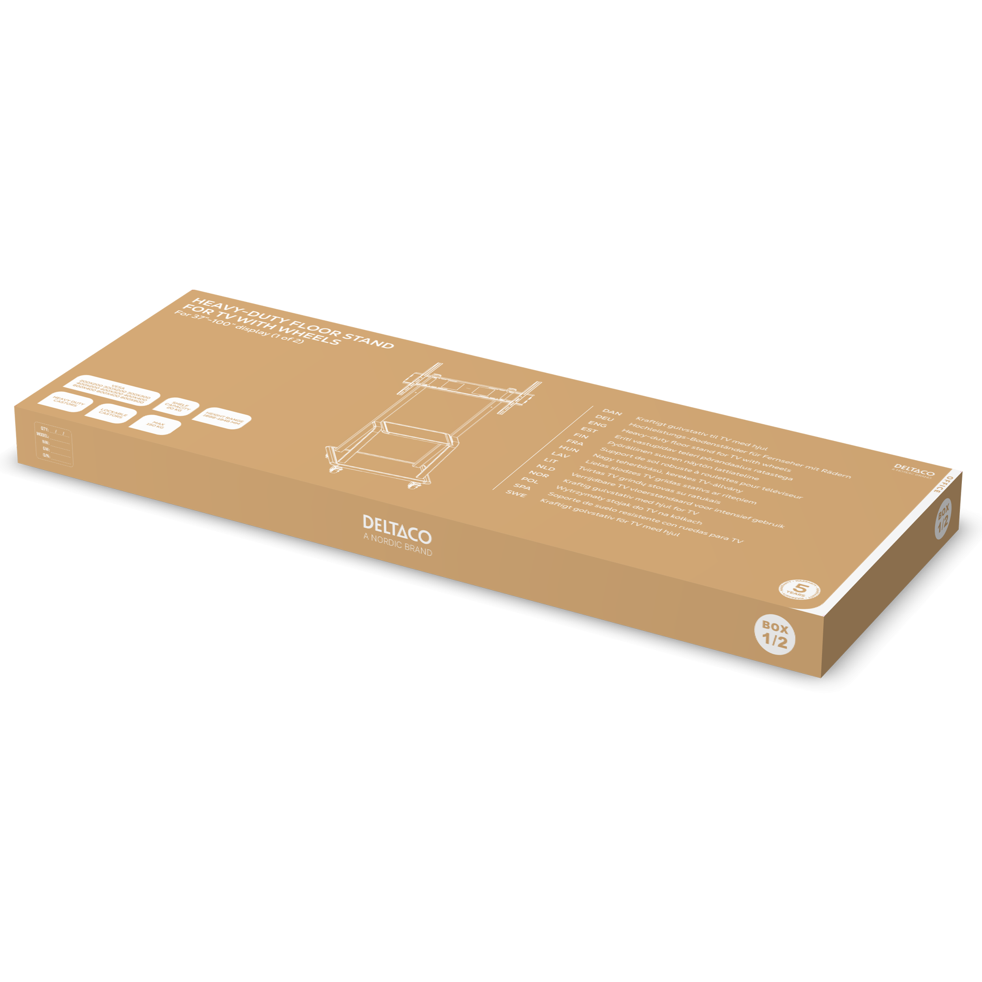 - Pakkens indhold (2x): Gulvstander med hjul, monteringstilbehør, værktøj og manual (1 af 2). Hylder til ARM-0453 (2 af 2)